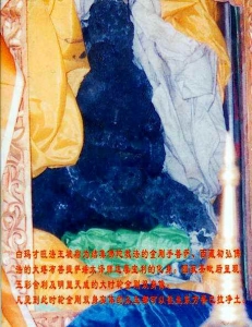 第五世华智仁波切缩小中的法体《大圆满前行引导文》作者华智(巴珠)仁波切的第五世化身吉美日比多吉仁波切。2008年9月圆寂。 缩小后的法体:现在身体已经缩小了,只是有衣服衬着,不显。在荼毗前一天更换法衣后,明显的看出来,身体比以前小了50%,大约40厘米高。